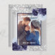 Fundo com aspecto fino prateado, decorado com flores azuis e azuis-marinhos, flores e brilho fino prateado, faíscas. Personalize e adicione sua foto, nomes e detalhes do casamento.