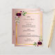 Na frente: Um elegante cartão de cardápio de boho boêmico. Penas e rosas de cor aquosa em burgundy. Personalize e adicione seus nomes, data e menu de casamento. Um quadro de ouro falso e um fundo metálico de rosa de ouro chic. Letras cinzas escuras coloridas. Volta: fundo rosa dourado, sua foto e adicione sua história de amor ou fatos divertidos. Dê às pessoas algo para falar enquanto espera que a comida seja servida!