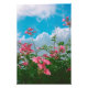 Linda fotografia da natureza com flores rosas vibrantes chegando em direção a um céu azul brilhante com nuvens fofinhas e uma lua crescente fraca. Um design sereno e elevador que captura a beleza pacífica da natureza.