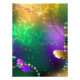 Fundo de grãos de cereais, iridescentes, textualmente, com manchas roxas, amarelas e verdes, decoradas com penas e miçangas brilhantes. feriado Mardi Gras.