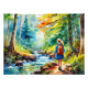 Esta é uma imagem de aquarela de uma menina caminhando perto de um riacho em uma floresta. Ele tem cores lindas e pareceria um excelente em uma mesa ou em qualquer lugar que você quiser. Só de olhar para ele me ajuda a me sentir mais à vontade.
