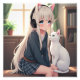 uma garota com fones de ouvido sentados ao lado de um gato branco e um gato branco sentado ao lado, Miho Hirano, arte peluda, tendências em pixiv, branco ( gato )