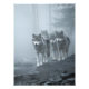 Four powerful gray wolves emerge from dense forest fog, standing alert on a dark, rocky path lined with ancient evergreens. Their intense gazes cut through the heavy mist while soft light filters through the trees, creating an atmosphere of quiet strength and untamed wilderness. This dramatic wildlife scene captures the mysterious beauty of the wild, perfect for canvas prints, posters, throw pillows, phone cases, mugs, blankets, and décor that brings primal forest energy into any space.