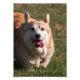 Uma doce fêmea Welsh Corgi fotografada enquanto corre por um campo de erva na primavera.