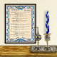 Os textos hebraico e inglês para a oração e música judaica Havdalah são apresentados num quadro azul vintage barroco e efeito pergaminho creme.