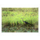Uma fotografia de um Herão Azul Excelente caminhando através de um lago. A superfície do lago está coberta de lírios de água. A lagoa está rodeada de pedúnculos de plantas verdes, que está perto de um campo. Fotografia Copyright ©2021 Kimberly J Tilley.