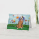 Cartão de aniversário para mulheres. Uma foto de cachorro em roupas, incluindo brincos. Fundo do céu e borboletas. Humorístico na natureza.