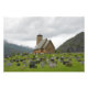 Impressão de fotografia de uma igreja de barcos de madeira com túmulos e túmulos num cemitério na borda de um fiorde entre as montanhas em Gaupne, Sogn og Fjordane, na Noruega.