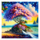 Uma bela pintura digital de uma exuberante ilha verde no meio do oceano. A ilha está coberta de árvores e flores exuberantes, e a água é um azul claro. Um pequeno barco está ancorado na baía, e algumas pessoas estão relaxando na praia. Esta pintura é perfeita para qualquer um que queira fugir para um paraíso tropical.