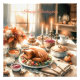 Cena de janto de Ação de Graças de Aquarela com um peru torrado ouro-castanho centrado numa mesa elegante. A luz de velas suave treme, lançando um brilho quente sobre uma série de sobremesas. Uma cozinha acolhedora com decoração rústica estabelece uma atmosfera acolhedora, que melhora o espírito festivo da reunião.