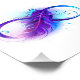 Símbolo infinito com uma bela pena pintada em cores roxas e azuis brilhantes sobre fundo branco.