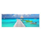 Impressão de foto do Panorama de um jato de madeira com alguns barcos coloridos e uma cabana amarrada na lagoa azul turquesa da ilha tropical do Pacífico, Rangiroa, perto do Taiti e Bora Bora na Polinésia Francesa.