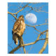Uma águia juvenil careca empoleirada num galho com três quartos de lua no fundo.