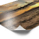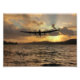 Um bombardeiro RAF Lancaster voando sobre a água enquanto o sol se põe