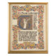 O texto latim católico "Te Deum" em uma escrita em letras góticas com uma borda iluminada de ouro com folhas e vinha do tipo trevo vermelho e azul. A ornamentado maiúscula T tem um anjo em pé com um dentro de rolagem. A caligrafia de ornamentado de estilo medieval com fronteira pintada é feita pela artista Letizia Morley. Um único excelente de decoração temerária cristã para muitas ocasiões diferentes.