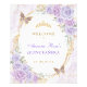Bem-vindos aos seus hóspedes com esta poster de boas-vindas quic e moderna quinceañera, com elegantes rosas púrpuras de aquarela, uma tiara de ouro e duas pequenas borboletas doces. Clique no botão "personalizar mais" se quiser reorganizar e formatar o estilo e a posição do texto.