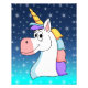 O unicórnio mais legal que já viveu com um homem multicolor e um ouro, ok amarelo. Seu corpo é branco com nariz rosa e ouvido rosa. O fundo é um gradiente de azul escuro a azul claro e pontilhado com faíscas brancas, apenas para adicionar alguma magia unicórnio.
