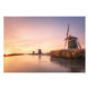 Foto impressão de uma paisagem com uma fileira de três moinhos de vento tradicionais e sementes ao longo de um rio congelado durante um colorido nascer do sol no inverno em Leidschendam, na Holanda.