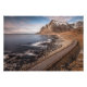 Fotografia paisagística da estrada para a aldeia pesqueira Vikten na costa de Lofoten, no Norte da Noruega, Escandinávia.