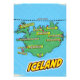 Um mapa do estilo pop da Islândia com um fundo azul brilhante e um padrão pontilhado. O mapa propriamente dito é verde com contornos pretos e apresenta várias cidades e cidades marcadas com pontos vermelhos e bolhas de fala amarelas. Os nomes das cidades são escritos em letras brancas dentro a negrito com as bolhas de fala.