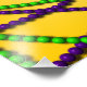 Máscara roxa cintilante com miçangas verdes e roxas em um fundo amarelo.