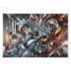 „Metallische Strömungen“ erforscht die Kontraste zwischen fließenden organischen Formen und scharfen, kristallinen Strukturen. Das Kunstwerk verbindet flüssige Elemente, die an geschmolzenes Metall und reflektierende Oberflächen erinnern, mit komplexen, winkligen Mustern. Die Farbpalette reicht von kühlen Silber- und Blautönen bis hin zu warmen Kupfer- und Bronzetönen und vermittelt ein Gefühl von Tiefe und Bewegung. Licht und Schatten spielen eine zentrale Rolle, wodurch die Komposition an Komplexität gewinnt und das Zusammenspiel von Chaos und Kontrolle, Natur und Technologie symbolisiert wird. Das Bild fesselt durch seine Dynamik und visuelle Spannung.