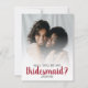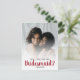 Planejar um casamento é um momento empolgante para qualquer um, decisões importantes de fazer como quem será sua dama de honra é apenas uma delas. Estes na moda, cartões mínimos são uma forma excelente de lhes pedir e dar-lhes-ão uma foto de guardar o tesouro para sempre. O cartão apresenta sua foto favorita de você e deles, e o texto diz "VOCÊ SERÁ MEU BRIDESMAID" com e é personalizado com o nome deles. Os estilos, tamanhos e cores da fonte de texto podem ser alterados clicando no link adicional personalizado após a personalização.