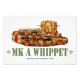 Uma descrição pormenorizada do Tanque Médio Britânico de Whippet da Primeira Guerra Mundial. Ilustração de aquarela engradada definida sobre um fundo branco. Vista lateral ou Perfil. Abaixo do tanque, o texto descreve-o como um Tanque Médio Britânico de WWI.