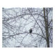 Uma fotografia de uma águia careca empoleirada em um galho de árvore que vigia a área. A imagem foi criada no inverno. As folhas deixaram as árvores e os galhos estão coletando pedaços de neve. Algumas speck de flocos de neve caem sobre a parte de trás das penas da águia. O céu é cobrir de nuvens. Imagem Copyright ©2021 Kimberly J Tilley.