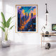 Uma paisagem urbana atmosférica ao anoitecer, onde azuis profundos e luzes néon quentes criam um brilho urbano cativante. A perspectiva dinâmica e os detalhes emparelhados dão a esta trabalho de arte um toque cinemático e dramático, perfeito para amantes modernos da decoração.