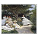 "Mulheres no Jardim" transporta espectadores para uma cena de jardim iluminado por sol onde figuras elegantemente ocupam um espaço luxuoso e verdioso. Esse trabalho é uma obra-prima do Impressionismo, mostrando uma exploração da luz, da cor e dos efeitos fugazes do ambiente natural. A canvas é cheia de cores vibrantes de flores florescentes e folhagem verdiana, que servem de pano de fundo para várias mulheres vestidas em voga da época. Cada figura é ilustrada com graça e fluidez, capturada em momentos de repouso ou lazer em meio ao tranquilo cenário do jardim. As pinceladas são vivas e espontâneas, transmitindo um sentido de movimento e imediatez que caracteriza o estilo impressionista. O jogo de filtragem da luz solar através das folhas cria padrões de luz e sombra aplicados no chão e na roupa, melhorando o sentido de profundidade e atmosfera dentro da composição. As cores são brilhantes e harmoniosas, com contrastes de luz e escuridão contribuindo para a qualidade dinâmica global da cena. O próprio jardim é descrito com detalhes meticulosos, sugerindo um espaço cuidadosamente cultivado que combina beleza natural com presença humana. Árvores, arbustos e flores são renderizados com um toque pareado, capturando a essência de um jardim florescente no esplendor de cheios. "As mulheres no Jardim" não é apenas uma representação de atividades ao ar livre, mas também um testemunho da habilidade de captar a essência de um momento fugaz no tempo. Convida os espectadores a mergulharem na beleza tranquila da natureza e a apreciarem a coexistência harmoniosa entre as figuras humanas e o mundo natural.