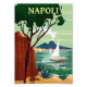 Nápoles Retro Poster Italia. veleiro do mar Mediterrâneo, vulcão fumador Vesúvio, costa, rocha, cartão postal ilustrativo