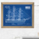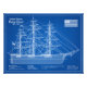 Este impressionante cartaz em estilo de planta azul retrata o histórico clíper americano Flying Cloud, um navio celebrado por sua notável velocidade e design elegante. Construído em 1851 no East Boston pelo famoso construtor naval Donald McKay, o navio representou o auge da engenharia de clíperes durante a idade de ouro do comércio marítimo. A linha branca contra o fundo azul profundo se assemelha a plantas técnicas tradicionais de engenharia, dando à imagem uma qualidade técnica e artística.