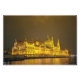 The grand, illuminated Hungarian Parliament building stands majestically along the riverbank of the Danube River in Budapest, reflecting its golden lights on the water's surface on a misty night. The night sky provides a dramatic backdrop, enhancing the structure's architectural elegance. Warm lights highlight the structure's ornate façade, creating a captivating nighttime scene.
