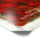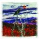 Num céu noturno com algumas nuvens está uma lua de cheio que é vermelha e ascensão sobre um conjunto de montanhas e colinas. Um corvo é empoleirado em um galho de uma árvore-passarinho-morto olhando para a floresta de árvores de folhas vermelhas. Trabalho de arte Copyright ©2018 Kimberly J Tilley.