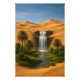 A captivating artwork depicting a cascading waterfall emerging between golden sand dunes, surrounded by lush palm trees and a vibrant green oasis. The painting reflects the contrast of nature between arid desert and flourishing greenery, creating a serene scene that transports the viewer to a world of tranquility and calm, where sand and water meet in stunning visual harmony.