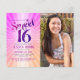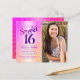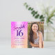Feliz 16 de aniversário. Enviar este legal retrato do boho, convite de festas personalizado do orçamento para um evento para lembrar. Do lado esquerdo, a divertida, tenda, ousada tipografia rosa-quente e roxa-escura com a serifografia sans moderna sobrepõe-se a um fundo de raios quadrados laranja-claro-pop e cor-de-rosa-verde com pontos brancos. Uma foto personalizada da aniversariante está à direita. A parte traseira apresenta um gráfico 16 branco, doce, sobre um fundo cor-de-rosa e cor de laranja mais escuro e um fundo pop cor de laranja brilhante. Adicione a foto dela e personalize o texto personalizado com o nome da sua filha, assim como outros detalhes da festa. Garantido para adicionar diversão de na moda à sua celebração especial de aniversário! Chapas, guardanapos, banners, autocolantes, cartões de agradecimento e outros doces de aniversário também estão disponíveis nesta coleção única e especial. Basta substituir a foto de modelo por uma de suas, digitar o nome da aniversariante e as informações do local da festa e você pode personalizar facilmente este convite de 16 anos doce. Por favor, me mande mensagens com quaisquer perguntas ou solicitações.