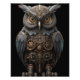 A commanding steampunk owl faces forward in striking detail, its face and body a masterful fusion of brass gears, copper rivets, layered clockwork plates, and feather-like textures. Prominent mechanical ear tufts rise above intense golden eyes, while the chest and wings reveal intricate cogs and ornate engineering against a deep black background. This powerful digital artwork perfectly blends avian majesty with Victorian machinery, ideal for canvas prints, posters, phone cases, mousepads, throw pillows, and décor that adds bold industrial fantasy to any space.