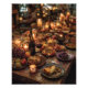 A lavish candlelit feast overflows across an intricately patterned table with glowing red wine, fresh grapes, apples, pears, crusty bread, and colorful ornate platters piled high with savory dishes. Warm golden candlelight and soft bokeh create an opulent, celebratory atmosphere full of rich textures and inviting abundance. This sumptuous digital artwork captures the magic of a bohemian-style gathering, perfect for canvas prints, posters, throw pillows, mugs, mousepads, and home décor that brings luxurious warmth and festive energy to any space.