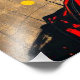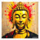 Uma estátua Buda ouro é representada em frente a um pano de fundo vibrante de contornos vermelhos e amarelos, criando um contraste visual impressionante. A expressão serena no rosto de Buda adiciona um senso de paz entre as cores dinâmicas.