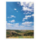Uma paisagem impressionante mostra colinas rolantes exuberantes sob um céu azul brilhante pontilhado com nuvens fofinhas. As cores vivas e os traços largos capturam a beleza da natureza.