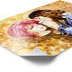 Uma representação artística vibrante de duas mulheres, uma sussurrando um segredo para a outra, contra um fundo de ouro geométrico, transmitindo amizade e confiança.