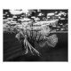 Um LionFish num tanque de aquário, com um reflexo na água superficial da tomada. A imagem está em preto e branco.