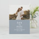 Anuncie seu dia especial em estilo com nossa Foto Personalizada Azul Moderno Salve o Cartão de Data. A metade superior apresenta uma foto, complementada por um texto branco sobre um fundo azul empoeirado abaixo. O dorso exibe elegantes monogramas brancos num pano de fundo azul empoeirado. Um jeito personalizado de marcar sua data de casamento.