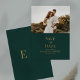 Anuncie seu dia especial em estilo com nossa Foto Personalizada Emerald Green Salve o Cartão de Data. A metade superior apresenta uma foto, complementada por um texto dourado sobre um fundo verde esmeralda abaixo. As costas exibem monogramas de ouro elegantes num pano verde esmeralda. Um jeito personalizado de marcar sua data de casamento.