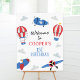 Blue How Time Flies Plane primeiro aniversario Welcome Sign Blue, vermelho com um toque de amarelo como o tempo voa primeiro sinal de boas-vindas de aniversário para um bebê apresentando alguns aviões, balões de ar quente e nuvens.