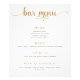 O Menu Bar de Casamento do Sol da Lua Celestial Moderna e o Suite de Casamento das Estrelas é uma sofisticada adição ao seu casamento no tema celeste. Apresentando um elegante fundo fora do branco, este poster bar é adorado com ouro e escrevendo preto que adiciona um toque de glamour e luxo à sua configuração de bar de casamento. O design é na moda e prático, com seções para vinhos, cervejas, bebidas espirituosas e bebidas não alcoólicas. O texto é apresentado numa mistura de impressão e rico, dando ao menu um aspecto clássico mas moderno. O cabeçalho do "menu bar" é exibido com destaque no script do rico, adicionando um elemento decorativo ao design. Este menu de bar não só é funcional, como também adiciona à conformidade geral da sua recepção de casamento. Ele serve como um guia de na moda para seus hóspedes, ajudando-os a navegar pelas opções de bebida disponíveis enquanto complementa o tema celeste do seu decoro de casamento. Coloque este Menu Bar de Casamento com outros itens do Sol de Lua Celestial Moderna e Suite de Casamento de Estrelas para um olhar coeso e encantador. Quer esteja servindo coquetéis sob as estrelas ou oferecendo uma seleção de bebidas com tema celeste, este menu de bar certamente impressionará seus convidados e melhorará a experiência geral de seu dia especial.