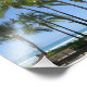 Céu azul, oceano azul, palmeiras suavemente balançando na praia de Waikiki, Havaí.