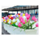 Uma grande variedade de tulipas coloridas num longo leito de madeira branco ao longo da parede do padre Aqudut. Um arranjo floral de tulipas cor-de-rosa, brancas, lavandas, vermelhas e amarelas é uma boa pré-visualização para a estação do Primavera no Big A. O pano de fundo mostra a famosa avenida desta pista histórica que foi reconstruída em 1959. Fleetphotoname
