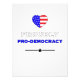 Coração com uma design de bandeira americana no topo da design. "Orgulhosamente" está escrito abaixo daquilo em negrito, com uma letra branca e um contorno preto, com "Pro-Democracia" escrito abaixo daquilo em letras azuis e negrito. Abaixo está uma pequena estrela negra com linhas em cada lado. Disponível em outros tamanhos e acabamentos de papel.